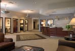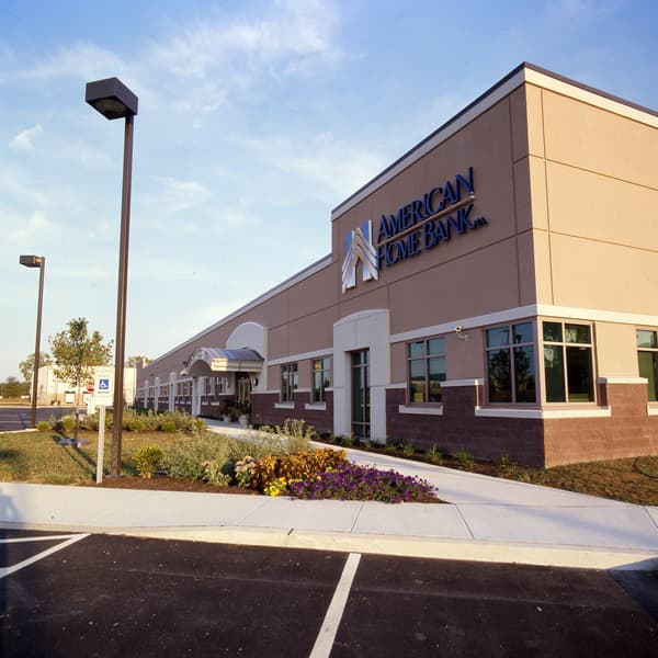 Greenfield Architects designed this 43,000-square-foot headquarters building for American Home Bank. The facility features red split-face block and Exterior Insulating Finish System (EIFS). The entrance is highlighted by a curved metal canopy with exposed steel. The executive area of the building includes stained wood door frames and textured painted walls, a tray ceiling with accent lighting in the board room, and a full kitchen. The floorplan includes open office areas, perimeter offices, multiple copier/coffee stations, a fitness center, a lunch room with vending, and an a patio area.